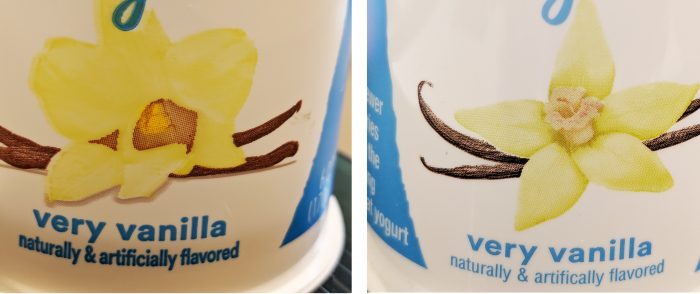 Great packaging is made up of clean and concise artwork. One example of this is the image of a vanilla bean flower as seen on a dairy product plastic package. The Polytainers’ Team was able to take a third-party design of a vanilla bean flower that appears dull yellow with little shape or form (Image 1, Left) and recreate it with precise color combinations, hues and saturation to give it depth/, detail, and dimension (Image 1, Right). The end result is an accurate representation of a true vanilla bean flower in photographic quality.